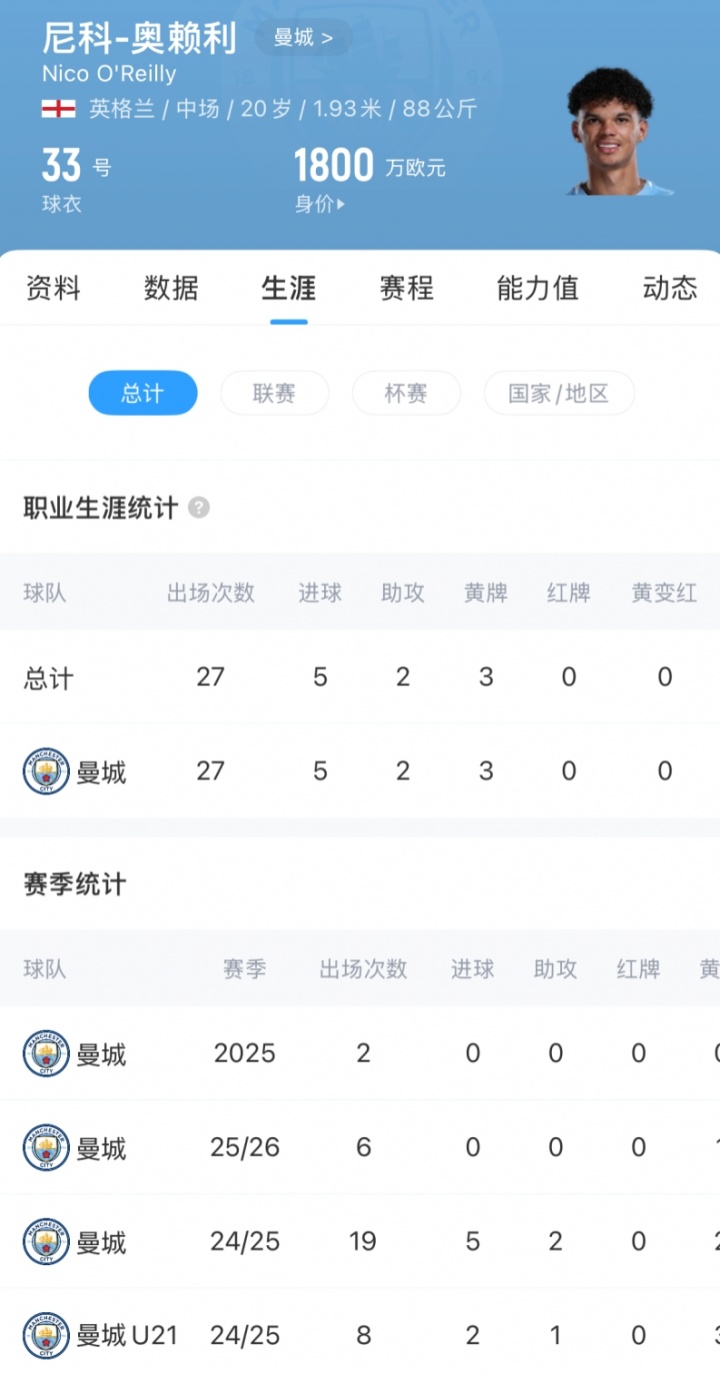 奥赖利现年20岁,身高1米93司职中场球员,足球直播无插件免费在线观看现德转估值1800万欧,新赛季至今他各赛事为曼城出场8次。