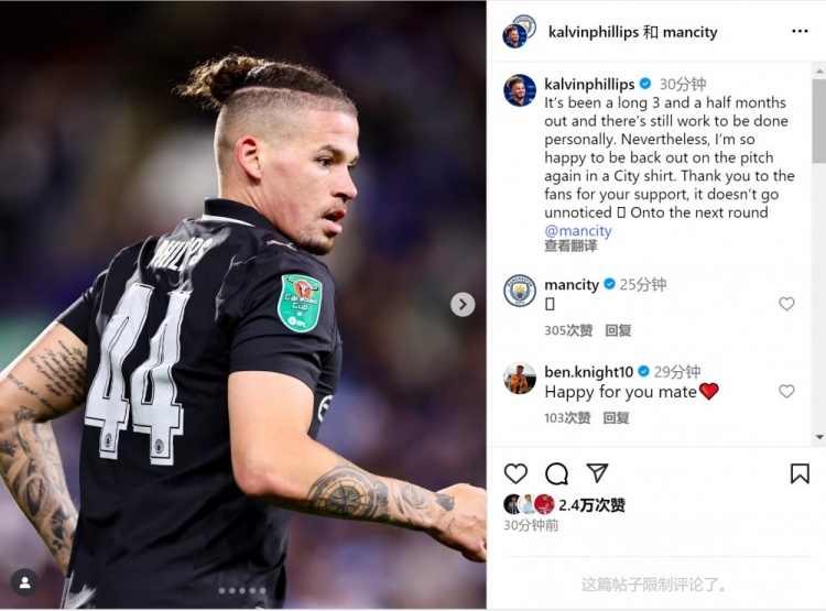 “但很高兴能够身披曼城运动活动 服 重返赛场西甲新闻最新信息,感谢球迷们的支持,这份心意我铭记于心,晋级下一轮 下一轮!”