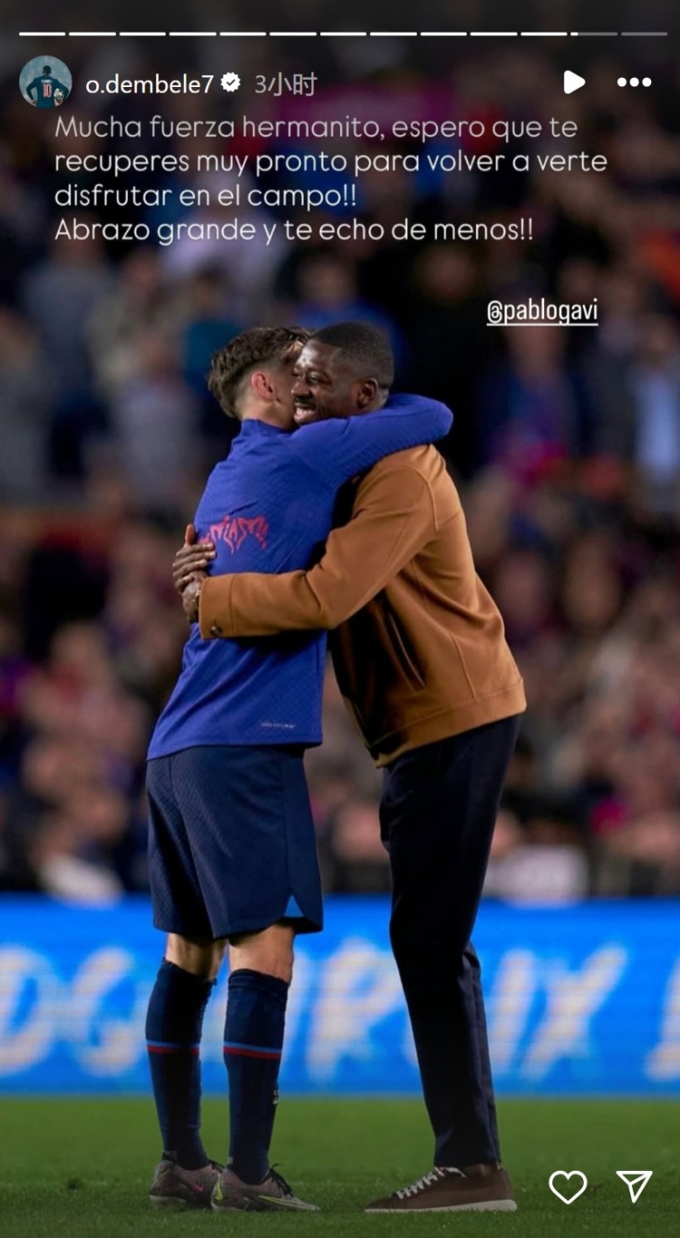 9月25日讯 巴萨中场球员加维接受膝盖手术,预计复健 时间5个月,登贝莱更新社媒动态,为他送上祝福。
