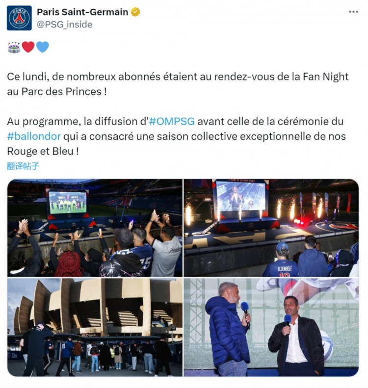 众多巴黎圣日耳曼季票持有者来到王子公园运动活动 场 ,免费欧洲杯直播参加球迷之夜活动,观看巴黎圣日耳曼客场应战 对阵马赛的赛事 、金球奖颁奖典礼直播。