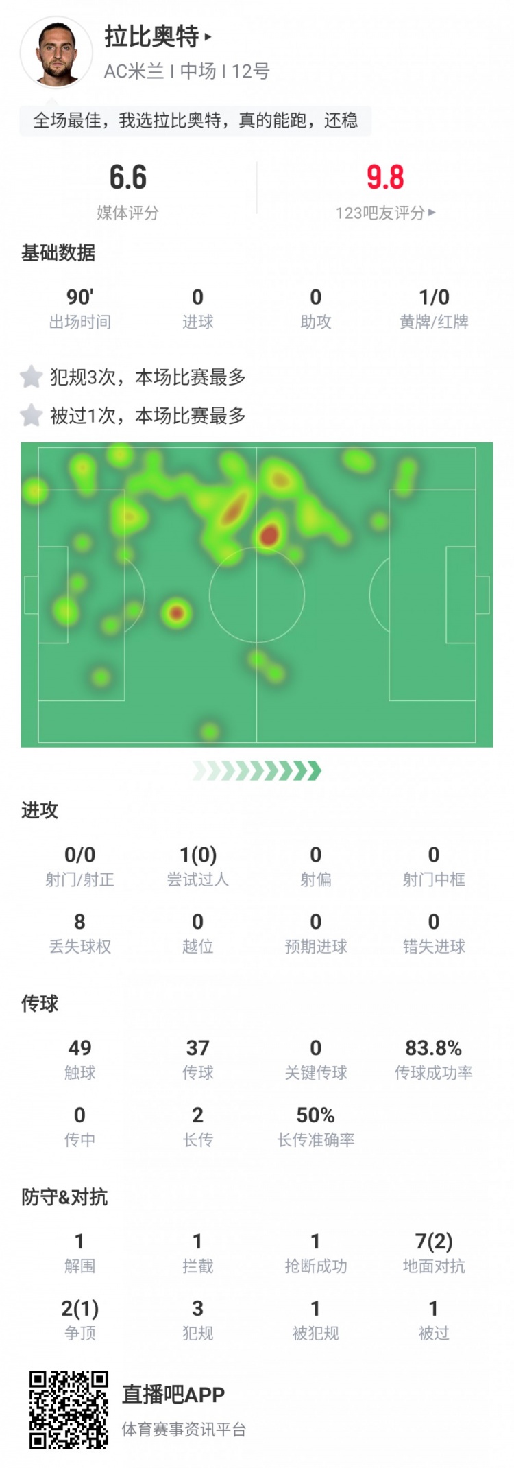 9月29日讯 米兰在本轮意甲2-1击败那不勒斯,杆位出场的拉比奥特踢满90分钟,免费欧洲杯直播以下是他的个人数据。