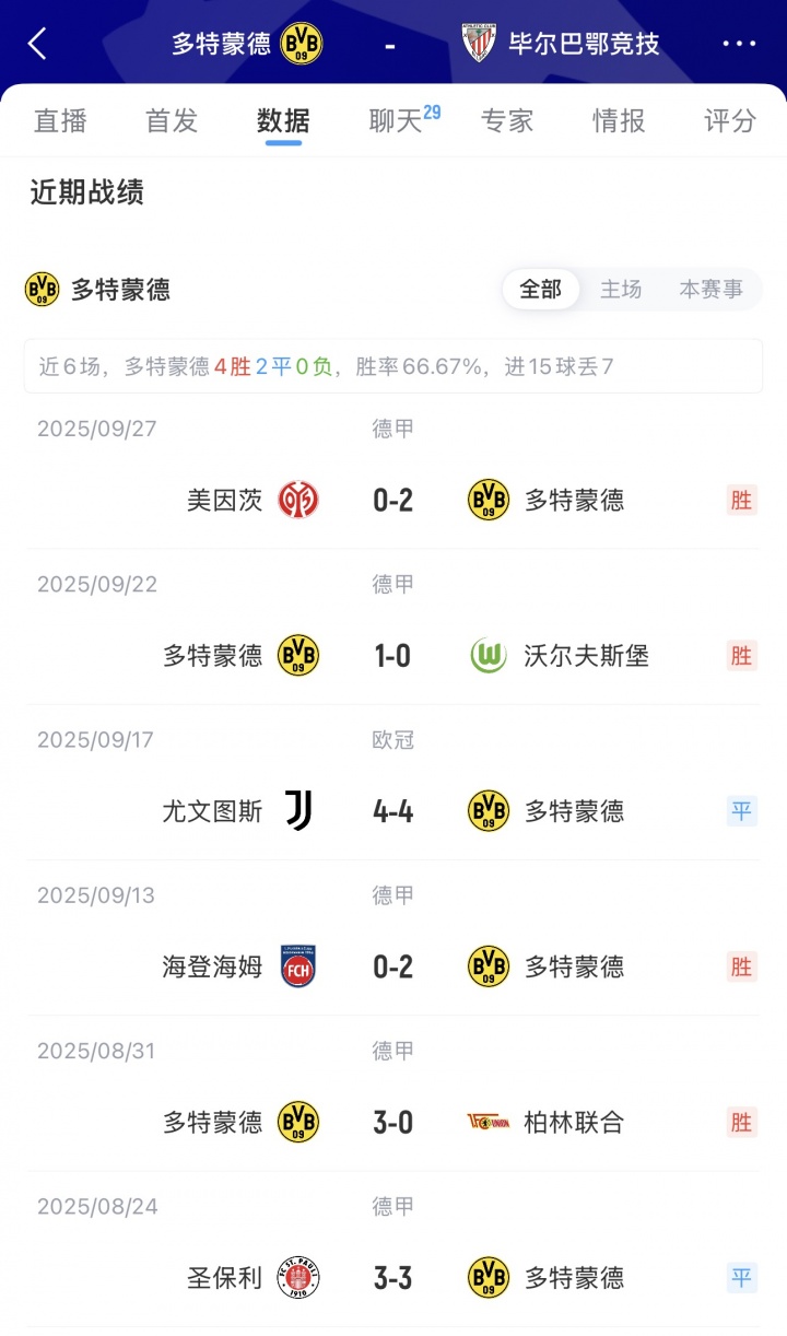 多特蒙德上一轮欧冠,客场应战 4-4战平尤文图斯;毕尔巴鄂竞赛 上一轮欧冠,主场作战 0-2不敌阿森纳!