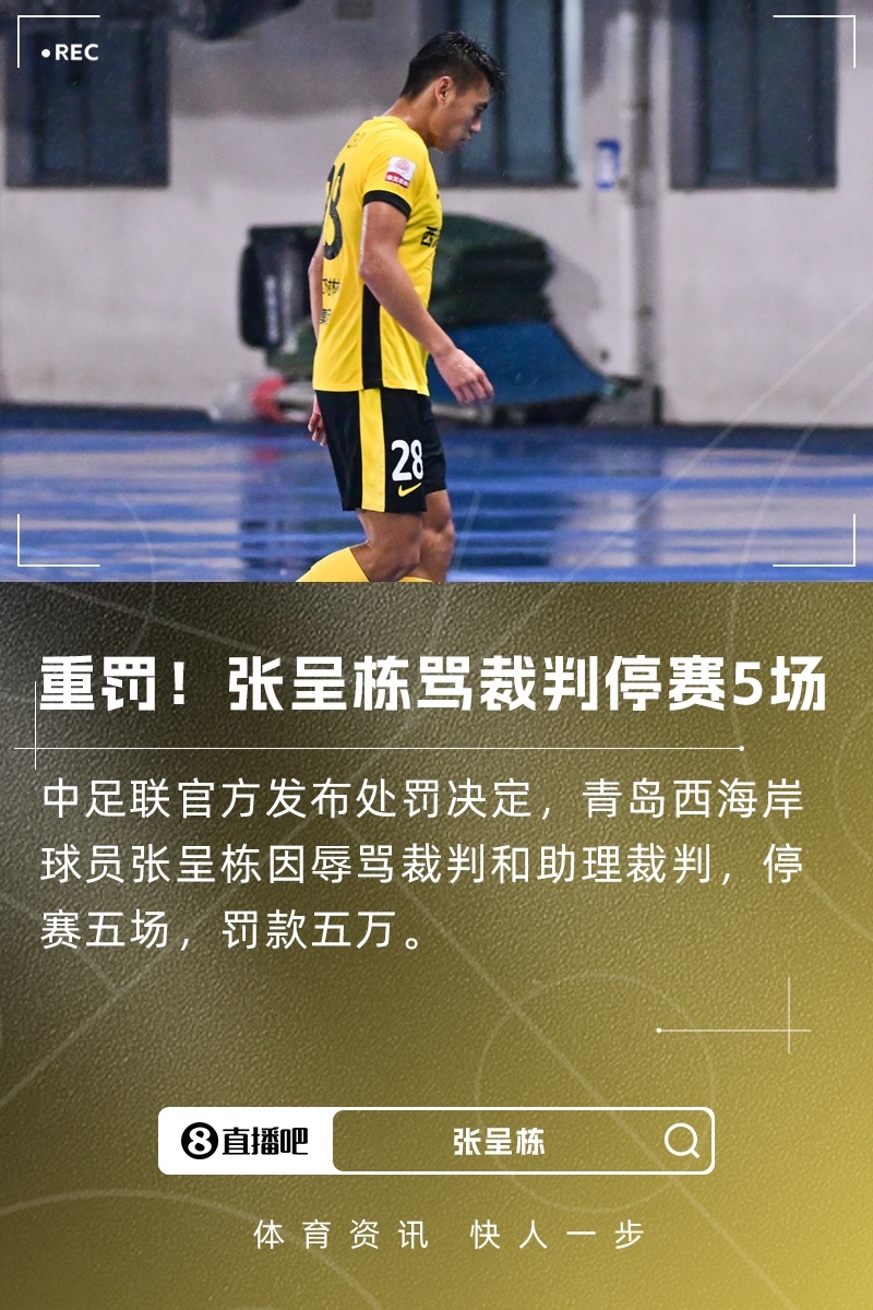 对青岛西海岸古代足球 俱乐部队球员张呈栋予以停赛5场,罚款人民币5万元。