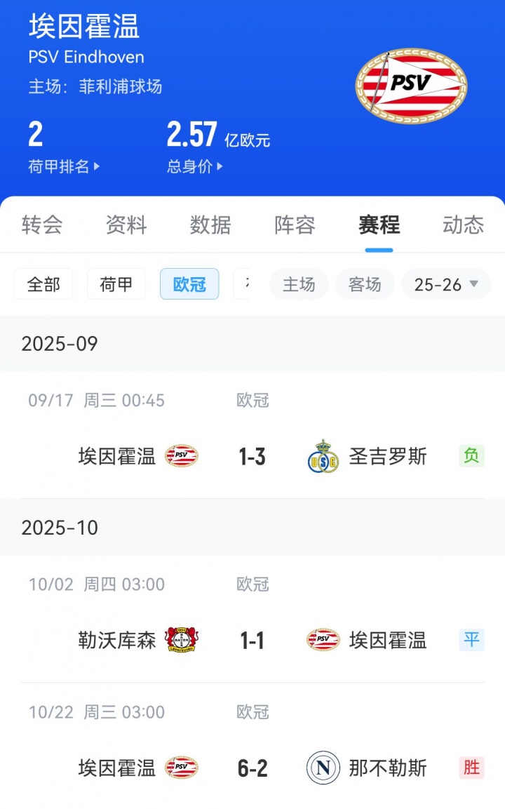 欧冠第二轮,埃因霍温还曾客场应战 与勒沃库森1-1战平,至今三轮的表现可谓“劫富济贫”。