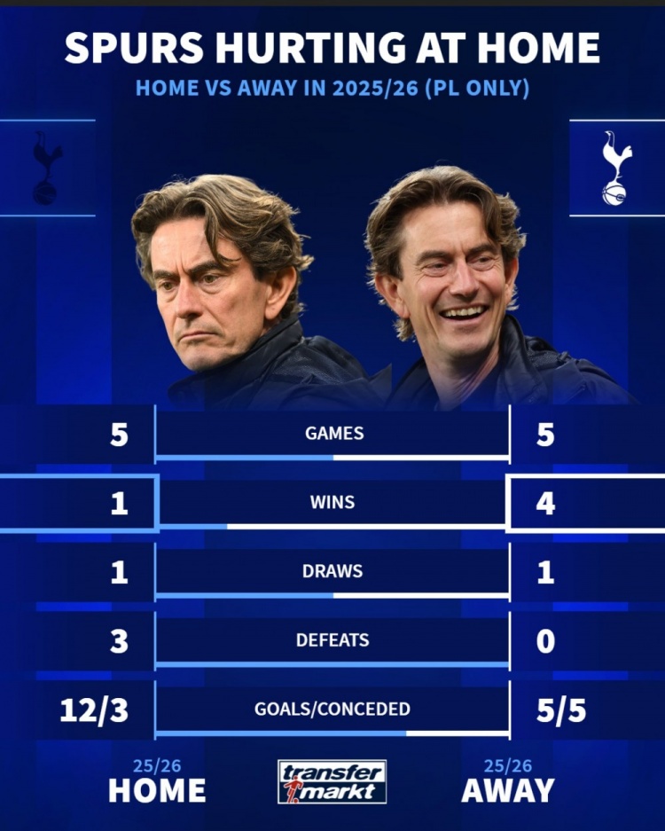 热刺本赛季英超主场作战 战绩1胜1平3负,打进5球丢掉5球,欧洲杯直播吧客场应战 4胜1平保持不败,打进12球仅丢3球。