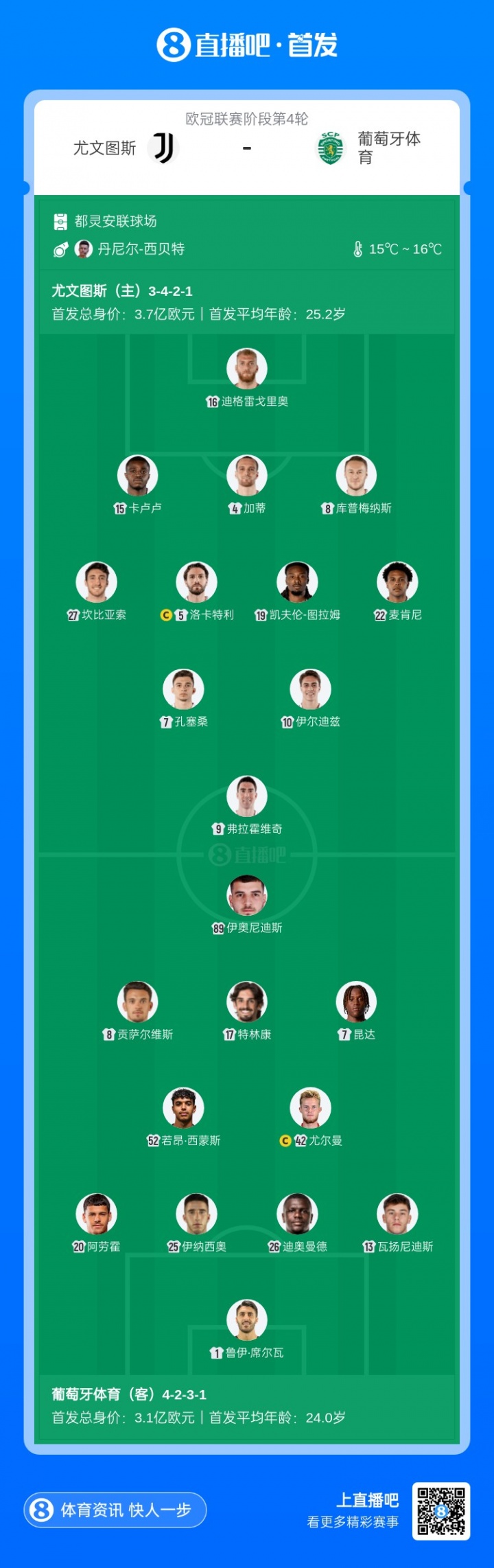 11月5日讯 北京时间11月5日凌晨4:00,欧冠第4轮,尤文图斯vs葡萄牙体育。赛前双方公布了杆位名单。