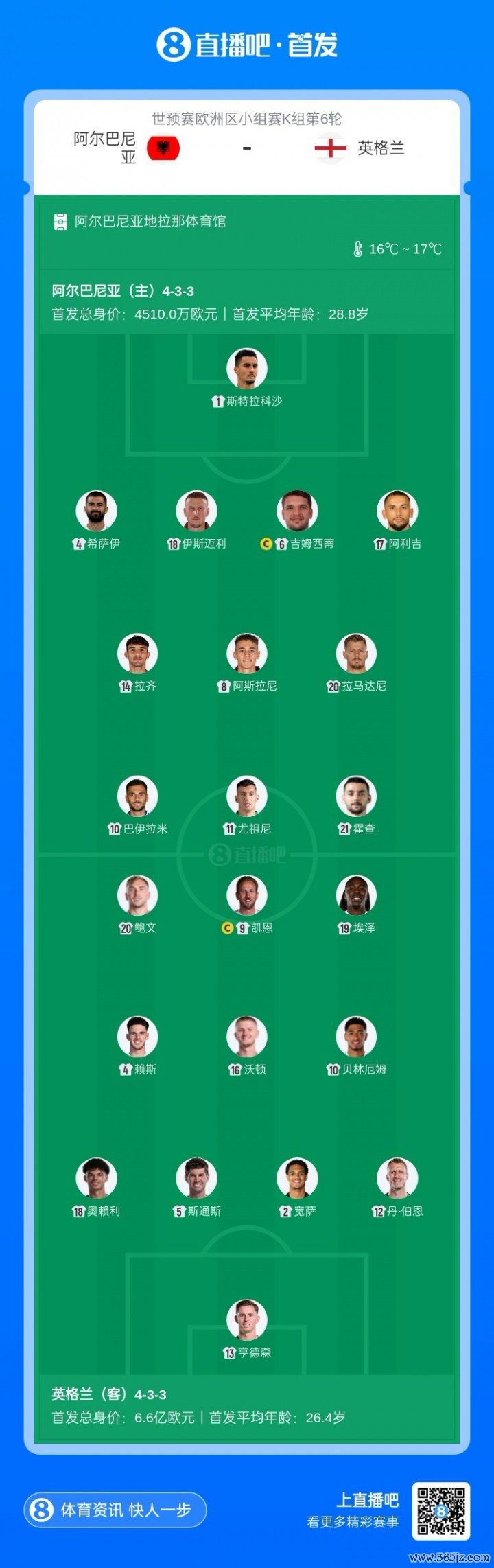 11月16日讯 世预赛欧洲区小组赛K组第6轮,英格兰客战阿尔巴尼亚,赛前双方杆位公布。